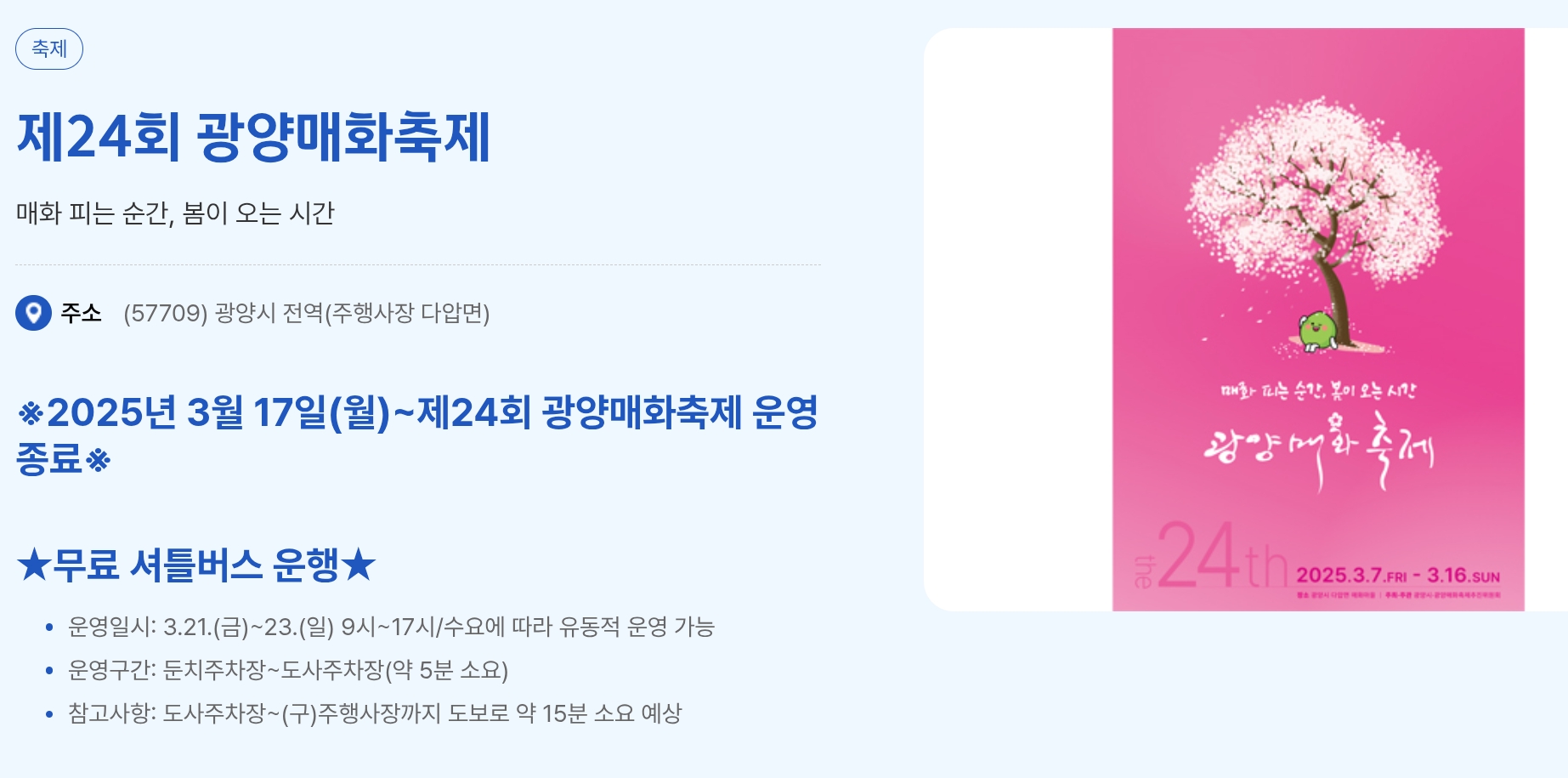 추가 문의사항은 광양시청 관광과(061-797-3772) 또는 광양매화축제 공식 홈페이지를 참고하세요. 댓글로도 질문 남겨주시면 답변드릴게요!